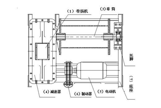 本結構采用行星齒輪傳動方式,通過聯軸器直接帶動卷筒轉動,并可簡易更換報廢鋼絲繩或改變鋼絲繩旋轉方向。制動機構